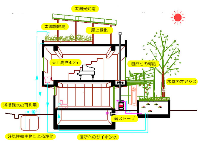 電化は快適で便利な住空間の実現を目指すものである。しかし、人間は電化に限らずあらゆる面で快適さを求めるあまり環境の保全を無視してしまった。今、切実な問題として追求しなければならないのはエコロジーにほかならない。そこで我が家では、いかに電力を利用してエコロジーを実現できるかという実験を行っている。太陽発電により起こした電力を使い、ライフラインのエコロジカルな自給自足を達成し動植物に囲まれた豊かな空間を追い求め続けたい。