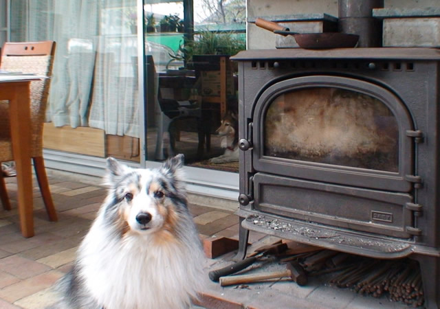 ・薪ストーブによる暖房(上部のステンレス熱変換器を通して蓄熱層へ循環)